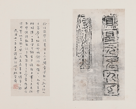 提要:秦朝统一度量衡,刻始皇二十六年(前221)诏书于量器上。诏书共四十字,文曰:“廿六年,皇帝尽并兼天下诸侯…乃诏丞相状、绾,法度量则不一歉疑者,皆明一之。”后多有拓本传世。是幅内收秦犛量全形拓及铭文,左侧邹寿祺墨笔题记,言海丰吴氏有一器与此同形,柄有“秦宰”二字,并考辨“犛”、“釐”之字意,落笔舒展,文雅可观。